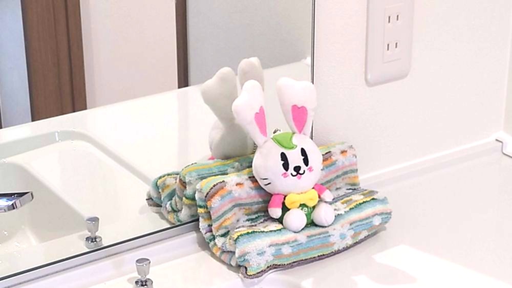 全日マスコット「ラビーちゃん」は洗面台の上でくつろいでいます。